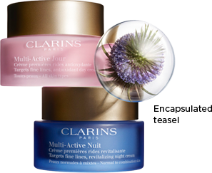 These new generation capsules are programmed, thanks to ligands, to target the devitalized fibroblast under attack. At the heart of this high-tech encapsulation system, used exclusively in Multi-Active Day & Night, Clarins has placed a very powerful plant extract of teasel. Selected for its antioxidant and revitalizing properties, it acts like an energizing battery at the heart of the skin.