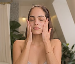 雙手以正常力道將卸妝液均勻塗抹在面部和頸部,能立刻帶來舒適的感受。